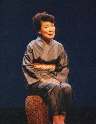 薄暗い舞台にもんぺ姿で登場し、「橋のない川」第5部をやさしく語り始める。住井すゑが絶賛したと言う耳で聞く橋のない川の世界。場内は活字とはひと味違う作品の暖かさと力強さに引き込まれていました。