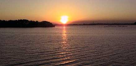 〝光る沼"、この表現は、住井すゑが小説の中で何度も使っている。牛久沼のことを〝大地のえくぼ"と称した住井すゑ。牛久市城中の彼女の自宅裏庭から見下ろす朝明けやの牛久沼はたしかに〝光る沼"であり、えくぼのような微笑でもある。一方、落日の牛久沼も〝光る沼"の表現にぴったりで、要吉が、3年ぶりに見る牛久沼、それは国道6号線沿い、鶴舞付近から見る夕日に反射した光る沼だった。とにかく、夕日が反射した牛久沼は美しい。