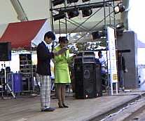 | 小雨降りしきるなか決行された龍ヶ岡の祭典、たつのこ祭り’98 この模様は茨城県を代表するメジャー放送局IBS茨城放送によって実況生中継、電波の届く限り全国放送された。 NHKでおなじみ歌のお兄さん・おねえさんの細野高裕、あべみえこ御両人によるキッズコンサート、カラオケ大会やクイズ大会、郷土芸能龍神太鼓、そして、なんと、、、、あの「思い出ぼろぼろ」の内藤やす子さんまで出演。残念ながら野外ステージの為、傘をもっての鑑賞となった。 |