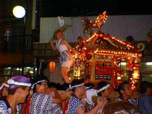 | 7月25日(日曜日)は天気も良く、祭り見物で賑わう商店街、掛け声勇ましい少年少女の神輿や各町内会の趣向を凝らした山車が次々と列を成す。そして夜も更けた頃、大人達による神輿パレードが盛大に繰り広げられた。 ことしも多くの観光客が竜ヶ崎市を訪れ、街は一晩中賑わった。 |