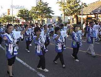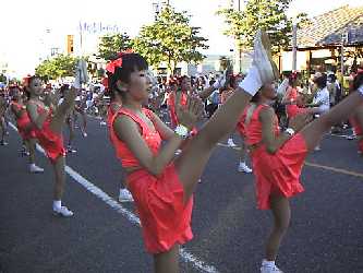 悩殺キックに参った参った。 8ビートのよさこい音頭。おもいおもいのコスチュームを身に纏い、激しいリズムに老若男女が踊る。 |