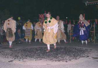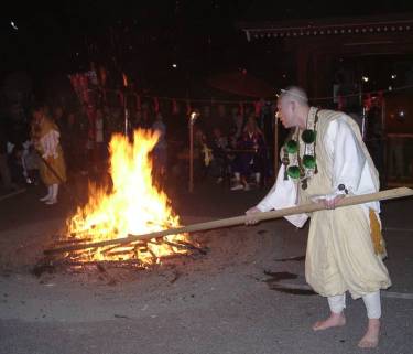 | まだ火の残った護摩の上を素足で渡る住職と山伏(火渡り式) | |