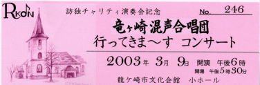 | 地雷ではなく花をください≠テーマに、我らが竜混(竜ヶ崎を代表する市民合唱団)は音楽の本場ドイツでチャリティーコンサートを開くことになりました。 7年前はドイツコンサートを、まるで夢のように語っていたそうです。その夢が今現実に。おめでとう竜混のみなさん。3月22日、23日のドイツコンサート頑張ってください。成功を祈ります。 |