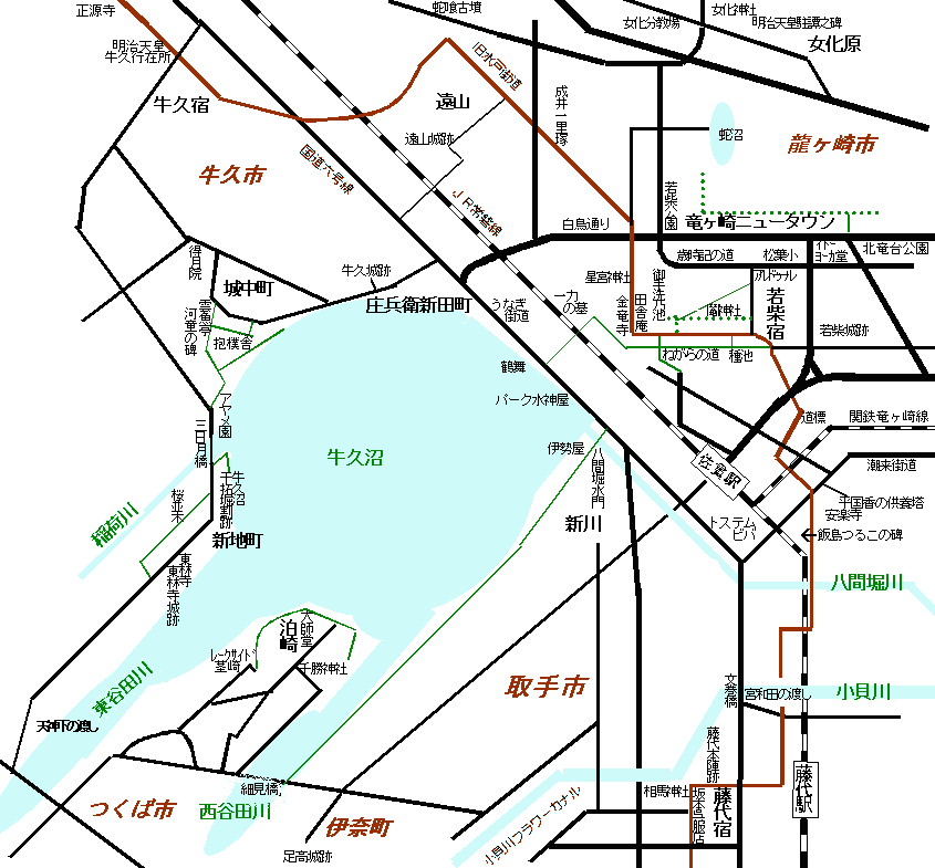 また地図上のリンク先の情報は当サイトで扱っているもの、あるいは過去に当サイトで扱っていた古い情報も含まれています。その点をご了承の上牛久沼周辺の散策の参考にして頂ければと思います。