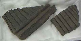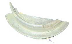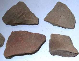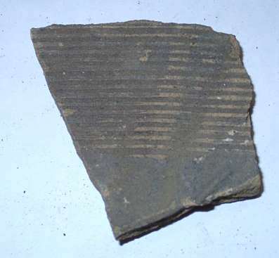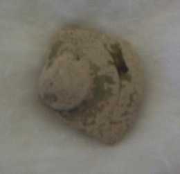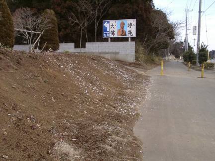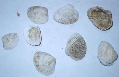 本日(平成13年2月10日)確認に行ったところ、白い物の正体は風化した貝殻と分りました。現場は民家の敷地内で公道を向いた2メートルほどの傾斜地で、貝殻が剥き出しの状態で散乱していました。漠然と見ていると単なる廃棄物ですが、しかしよく見ると同じ場所に縄文時代の物と思われる土器の破片が埋もれていて、これは貝塚だなと、すぐに分りました。