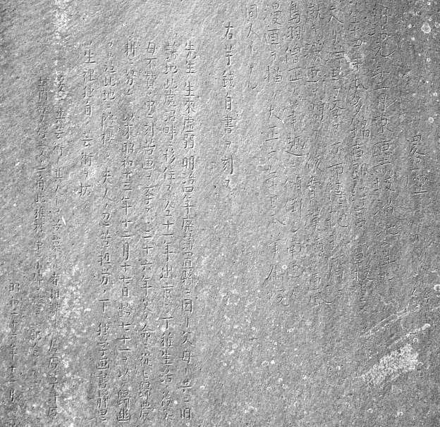 芋銭自筆による略歴が刻まれている。(クリックすると芋銭直筆の裏面が出てきます。)
