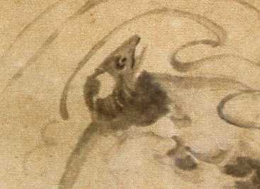 芋銭は、東洋的自由の象徴として河童を好んで画いた。ここで描かれた河童も然り。自由のびのびと遊んでいる。ところが、よく見ると、河童であるはずの顔の部分が、明らかに鮭なのである。何を意図しているのか分からないが、芋銭が文村に滞在した時代の利根川は、鮭がよく釣れたという。それも最上級の鮭が。芋銭の画の奥の深さ不思議さを示している一例である。