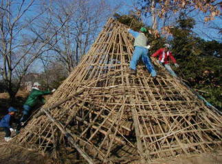 | 萱をとりはらった竪穴式住居 | 我らが棟梁、Hさん |