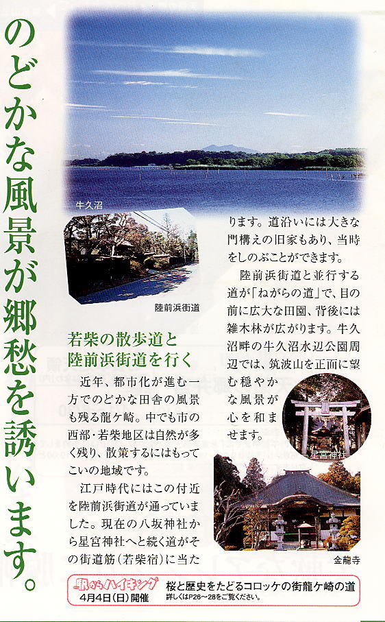 「ニュータウンの開発で都市化が進む龍ケ崎市にあって、水田や野菜畑、雑木林など豊かな自然が残る若柴地区。新興住宅地を囲んで3つに分かれる同町のうち、かつて水戸街道の宿場が置かれた界隈は、神社・仏閣や重厚な門構えの旧家が立ち並び、落ち着いた風情が漂う。旧街道から脇道へ足を踏み入れると、スギやヒノキなどの木立に囲まれた小道が続き、格好の散歩コースになっている。」として紹介