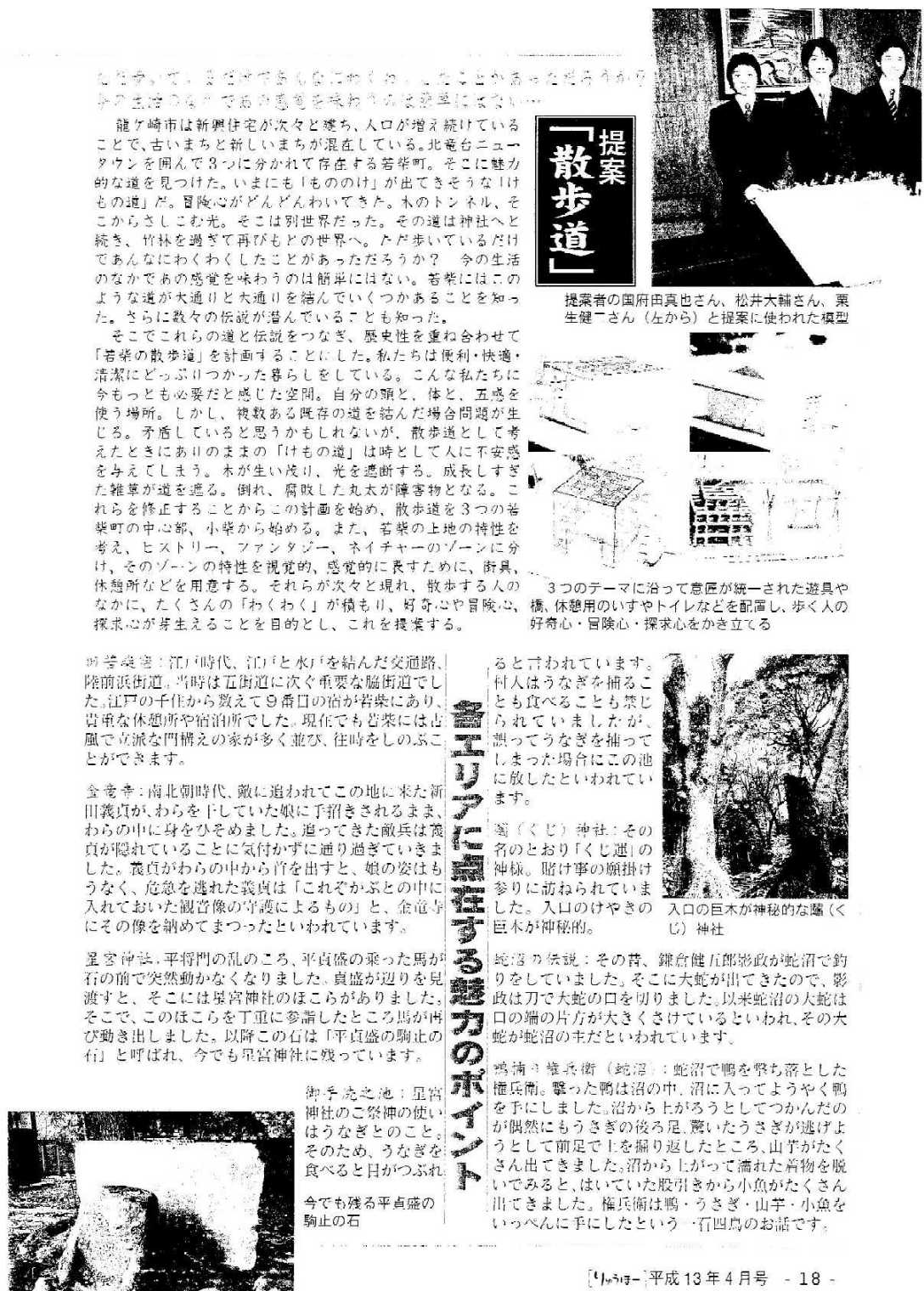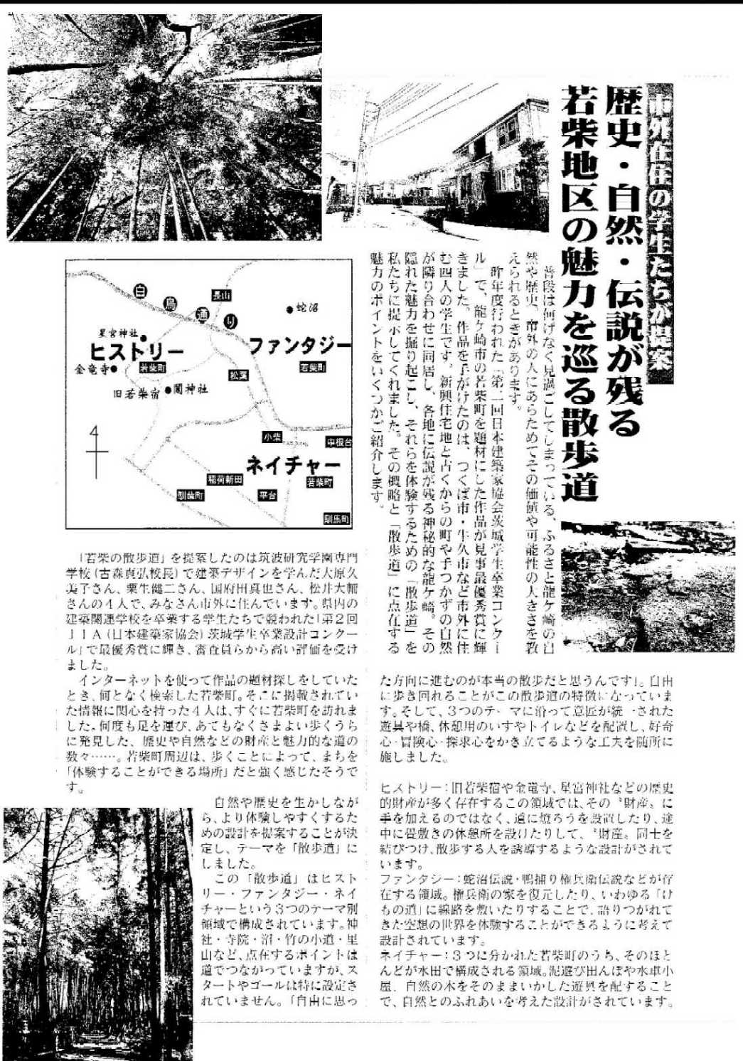 この情報は、当サイト「竜ヶ崎・若柴の散歩道」HPを参考資料として、筑波研究学園専門学校の学生4名が、建築デザインの立場から「若柴の散歩道」を提案。ヒストリー・ファンタジー・ネイチャーという3つのテーマて区分けされている。
